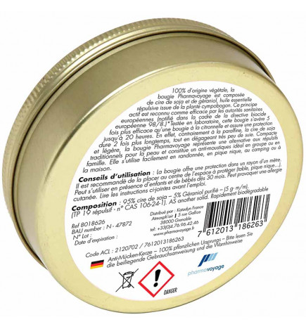 Die Mückenschutzkerze von Pharmavoyage ist doppelt so wirksam wie Citronella. Sie besteht aus Sojawachs und Geraniol, einem ätherischen Öl aus der Palmarosa-Pflanze, sowie Cympobogan. Sie leuchtet Ihnen den Weg und hält Insekten beim Camping, Picknicken und Biwakieren fern.