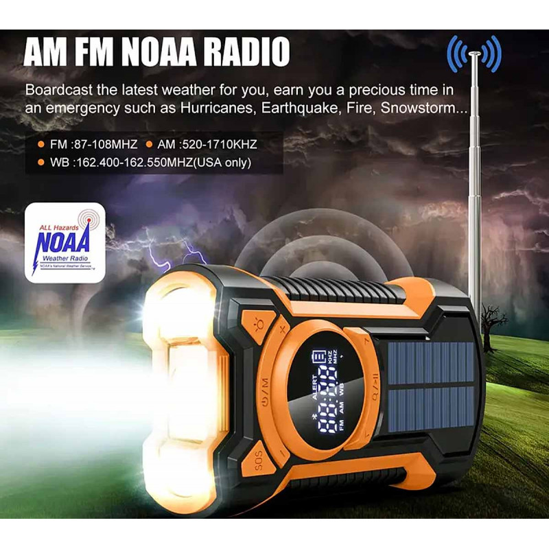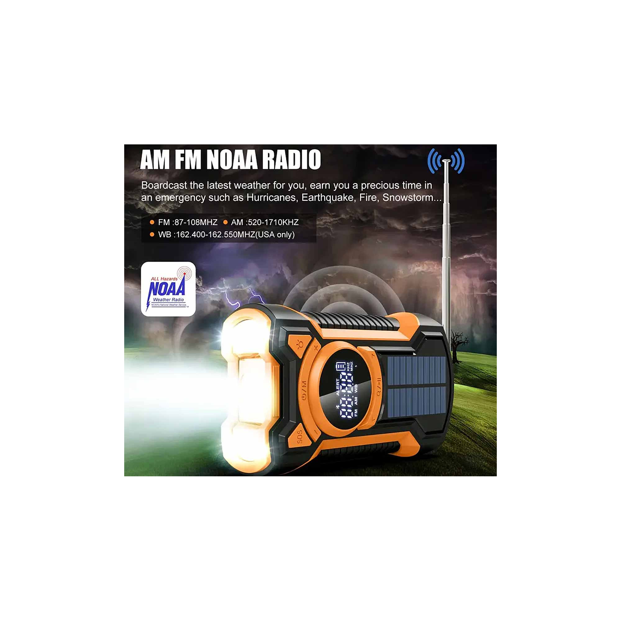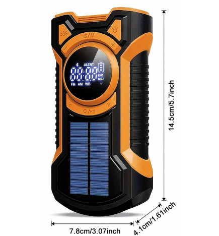 Wasserdichtes, kompaktes und robustes Notfallradio mit Handkurbel, das immer einsatzbereit ist. Es empfängt Weltnachrichten auf AM und FM. Es ist mit einem eingebauten Lithium-Akku ausgestattet, der über USB Typ-C, den eingebauten Generator oder im Notfall dank der eingebauten Solarzelle bei Sonnenschein aufgeladen werden kann. Es ist mit einem Akku (5000 mAh), einer Taschenlampe und einem Leselicht, einer Tastensperre, einem Kopfhöreranschluss, einer SOS-Alarmtaste, einer Batteriestandsanzeige und einer Aufhängeöse ausgestattet. Die helle Taschenlampe bietet drei verschiedene Beleuchtungsmodi. Der SOS-Alarmknopf löst im Notfall einen lauten Alarm aus, um Aufmerksamkeit zu erregen. Ideal für Ihre Outdoor-Aktivitäten, auch Wasseraktivitäten.