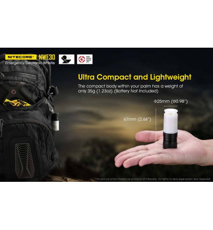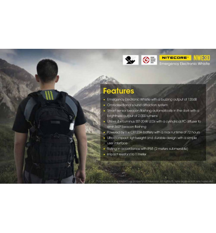 The NiteCore NWE30 is an ultra-compact emergency electronic whistle with an intuitive twist-and-vibrate interface. Emitting a 360° 120 dB audible signal, it automatically activates a 2,000-lumen omnidirectional light at night. With a battery life of up to 72 hours, it gives you the best chance of being rescued.
