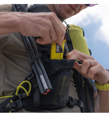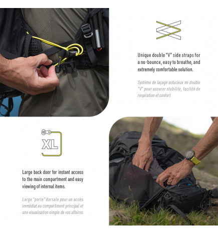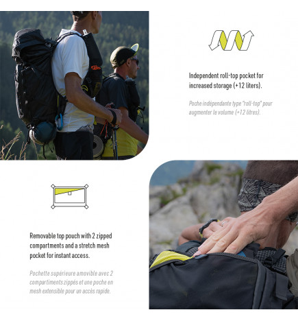 Una “puerta” trasera = acceso inmediato al compartimento principal para ver fácilmente sus pertenencias. Un bolsillo de malla elástica con cierre garantiza un almacenamiento rápido. Un bolsillo independiente tipo “roll-top” para aumentar el volumen (12 litros). Bolsillo superior extraíble con 2 compartimentos con cremallera para objetos pequeños (kit de seguridad, linterna frontal, herramientas, etc.). Un bolsillo de malla elástica proporciona almacenamiento inmediato para una chaqueta impermeable, un poncho, guantes o incluso un panel solar.
