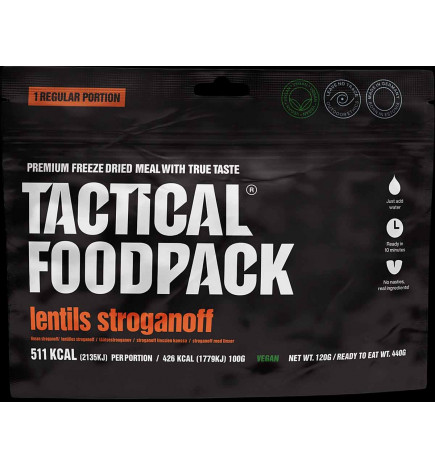 Découvrez les saveurs riches et crémeuses des lentilles Stroganoff Lyophilisés de Tactical FoodPack, une version végétalienne de ce plat classique. Léger et lyophilisé pour plus de commodité, ce plat délicieux est prêt en 8 minutes, où que vos aventures vous mènent.