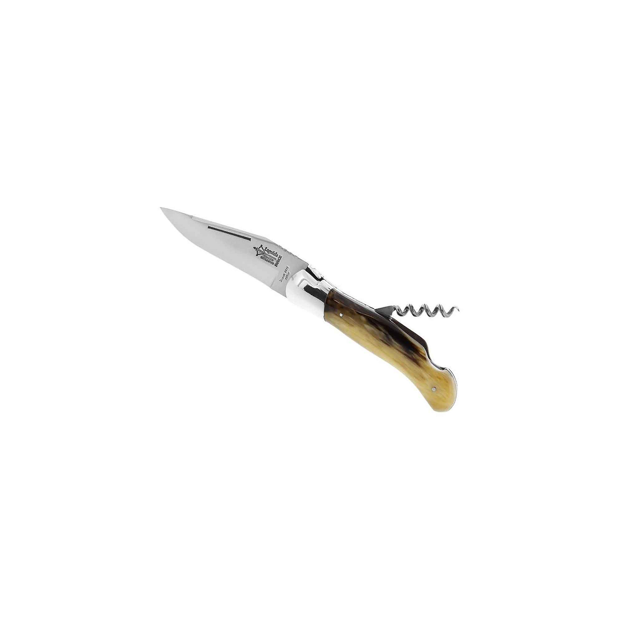 Magnifique couteau pliant Laguiole Grande Nature, manche façon corne blonde de 12 cm de long, 2 pièces : la lame inox et le tire-bouchon, ressort guilloché.