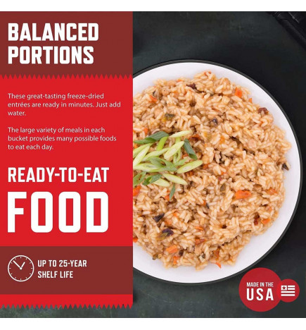 Scorte alimentari di emergenza e sopravvivenza ReadyWise, che garantiscono un'alimentazione completa per 13 giorni. Ogni contenitore contiene 120 porzioni con 13 diverse opzioni di pasto tra cui scegliere. Le buste per alimenti durevoli e conservabili mantengono le razioni fresche fino a circa 25 anni.