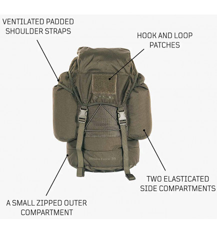 Il robusto e comodo zaino Sleeka Force di Snugpak è progettato per l'escursionismo e le avventure cross-country, con una capacità di 35 litri e un peso di soli 850 g. L'ampio scomparto principale è facilmente accessibile.