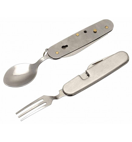 ナイフ、ボトルオープナー、缶切り、フォーク、スプーンの5つの機能を備えた、2つのパーツに分解できるステンレス製カトラリー。ピクニック、旅行、キャンプ、ビバーク、ハイキングなどに便利なカトラリー。