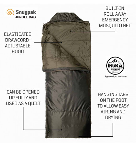 ジャングル バッグ: 暑く、汗ばむ、湿気の多い条件でのパフォーマンスを考慮して選ばれたトラベルソフト断熱材を使用したトロピカルな Snugpak 寝袋です。 寝袋の頭から閉めることができる隠し蚊帳ロールが付属しており、蚊だけでなくあらゆる種類の昆虫に対するバリアになります。この寝袋は広げてグランドシートとして使用できます。