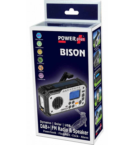 PowerPlus Bisonラジオは、コンパクトで堅牢なソーラー&ダイナモ式緊急ラジオです。DAB+/FM受信機を搭載し、連絡手段の確保が不可欠な緊急時やセキュリティ状況での使用を想定して設計されています。充電方法は、手回しダイナモ、ソーラーパネル、USBポートの3種類から選択可能です。スマートフォンなどの5V対応ポータブル機器を充電できるポータブルバッテリーも付属しています。さらに、Bluetoothスピーカーとしても機能します。大音量のアラームと点滅LEDを備えたSOS機能も搭載しています。フル充電されたバッテリーで、約7時間のラジオ使用が可能です。