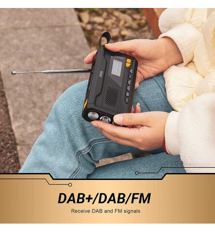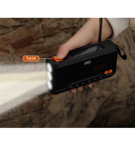 Augustラジオは、DAB/DAB+/FM受信機を搭載したコンパクトなソーラー&ダイナモ式緊急・サバイバルラジオです。主に連絡手段の確保が不可欠な緊急時やセキュリティ状況向けに設計されています。充電方法は、手回しダイナモ、ソーラーパネル、USBポートなど複数あります。スマートフォンなどの5Vポータブル機器を充電できるポータブルバッテリーも搭載しています。さらに、Bluetoothスピーカーとしても機能します。強力なアラームと点滅LEDを備えたSOS機能も搭載されています。 MB290 Augustはフル充電で数日間使用可能です。音量60%の場合、Bluetooth音楽再生は最大60時間です。高音質スピーカーと高性能バッテリーのおかげで、ラジオアンテナは使用していないときは消費電力が少なく、バッテリー寿命を延ばします。また、1回の充電で30時間の連続ラジオ再生が可能です。