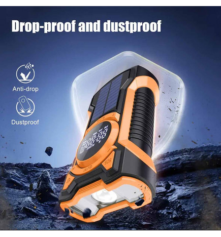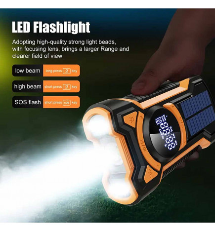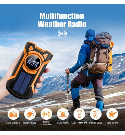 防水性があり、コンパクトで頑丈な、いつでも使える手回し式緊急ラジオ。 AMとFMで世界のニュースを受信できます。内蔵リチウム電池を搭載しており、USB Type-C、内蔵発電機、または緊急時には太陽光が照っているときに内蔵太陽電池で充電できます。バッテリー(5000mAh)、懐中電灯、読書灯、キーロック、ヘッドフォンジャック、SOSアラームボタン、バッテリーレベルインジケーター、吊り下げループを備えています。明るい懐中電灯には 3 つの異なる照明モードがあります。 SOS アラーム ボタンは、緊急時に注意を引くために大きなアラームを鳴らします。屋外でのアクティビティ、さらには水上でのアクティビティにも最適です。