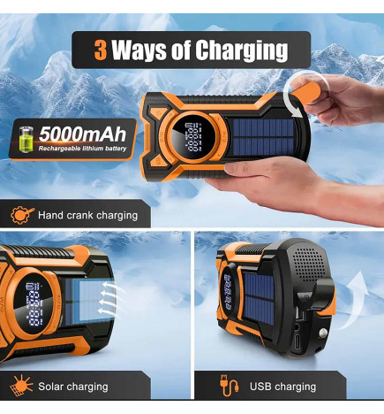 緊急用ラジオ防水クランクを備え、コンパクトで丈夫、いつでも使用できます。 AM/FM で情報を拾うこのラジオは、主に緊急時など連絡が重要な状況向けに設計されています。充電可能な電源は複数あります: 手回し発電機、ソーラーパネル、USB ポートなど