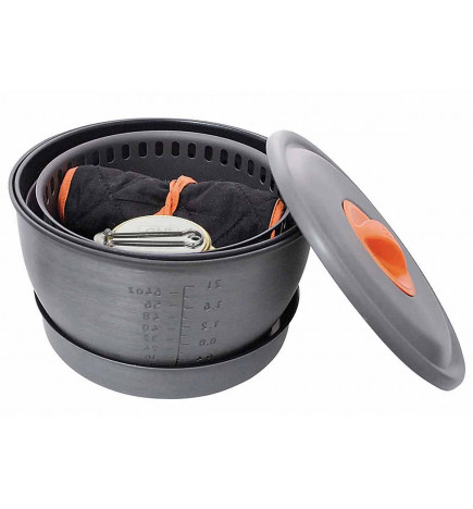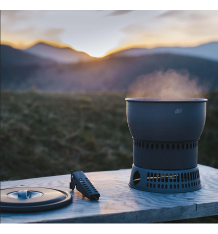 Esbit の陽極酸化アルミニウム製キャンプ用調理セット、ストーブと調理鍋があれば、野営や遠征中にどんな天候でも 4 人分の食事を素早く簡単に準備できます。