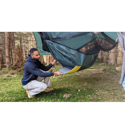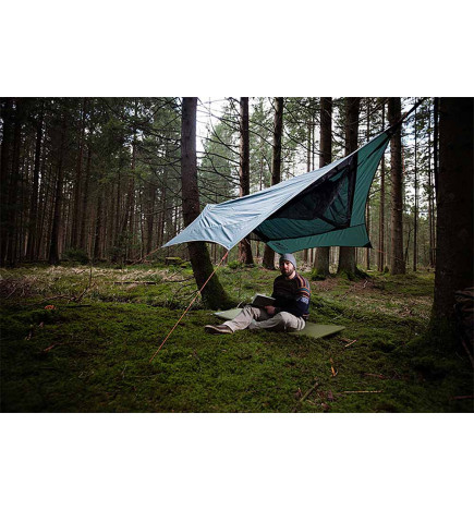 A rede mosquiteira Traveller Camp de Amazonas é certamente a rede mais avançada para viajar com pouca bagagem, ao abrigo dos mosquitos, da chuva e do sol. O Traveller Camp consiste em uma rede ultraleve conectada com segurança a uma lona por meio de uma rede mosquiteira extragrande. Isto dá-lhe um lugar para dormir, uma rede mosquiteira e protecção contra o vento e a chuva. Fácil de montar em apenas alguns passos simples. Pendure a rede entre duas árvores (graças às setas brancas nos acessórios da rede, você pode ver imediatamente onde a rede deve ser fixada. Em seguida, aperte o Ridgeline pré-montado e ajuste a altura da rede de acordo com suas necessidades. Em seguida, prenda o quatro cantos da lona até o chão usando as cordas e estacas fornecidas. O Ridgeline, a corda que segura a lona, já vem pré-montada. Você pode ajustá-la de maneira confortável e contínua usando um mosquetão especial para apertar a lona. Com o mosquito rede já cosida, a rede oferece um amplo espaço interior sem necessidade de ser desdobrada. Isto dá a impressão de um espaço agradavelmente protegido. A linha de cumeeira que passa dentro da rede mosquiteira permite guardar uma agenda ou pequenos objetos ao seu alcance. compartimento sob a rede para inserir um colchão e protegê-lo do frio vindo de baixo.