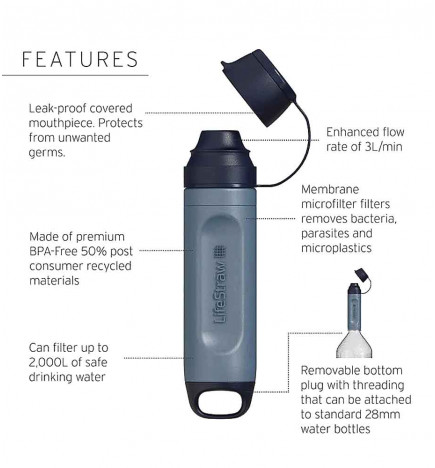 Filtro de água Lifestraw® compacto e ultraleve (48 g), com fluxo sonoro taxa de 3L/min é perfeito para caminhadas, camping, viagens ou até mesmo situações de emergência. Este filtro pode ser conectado a qualquer gargalo comercial, como Evian, Badoit ou outra garrafa, para obter água limpa e purificada.